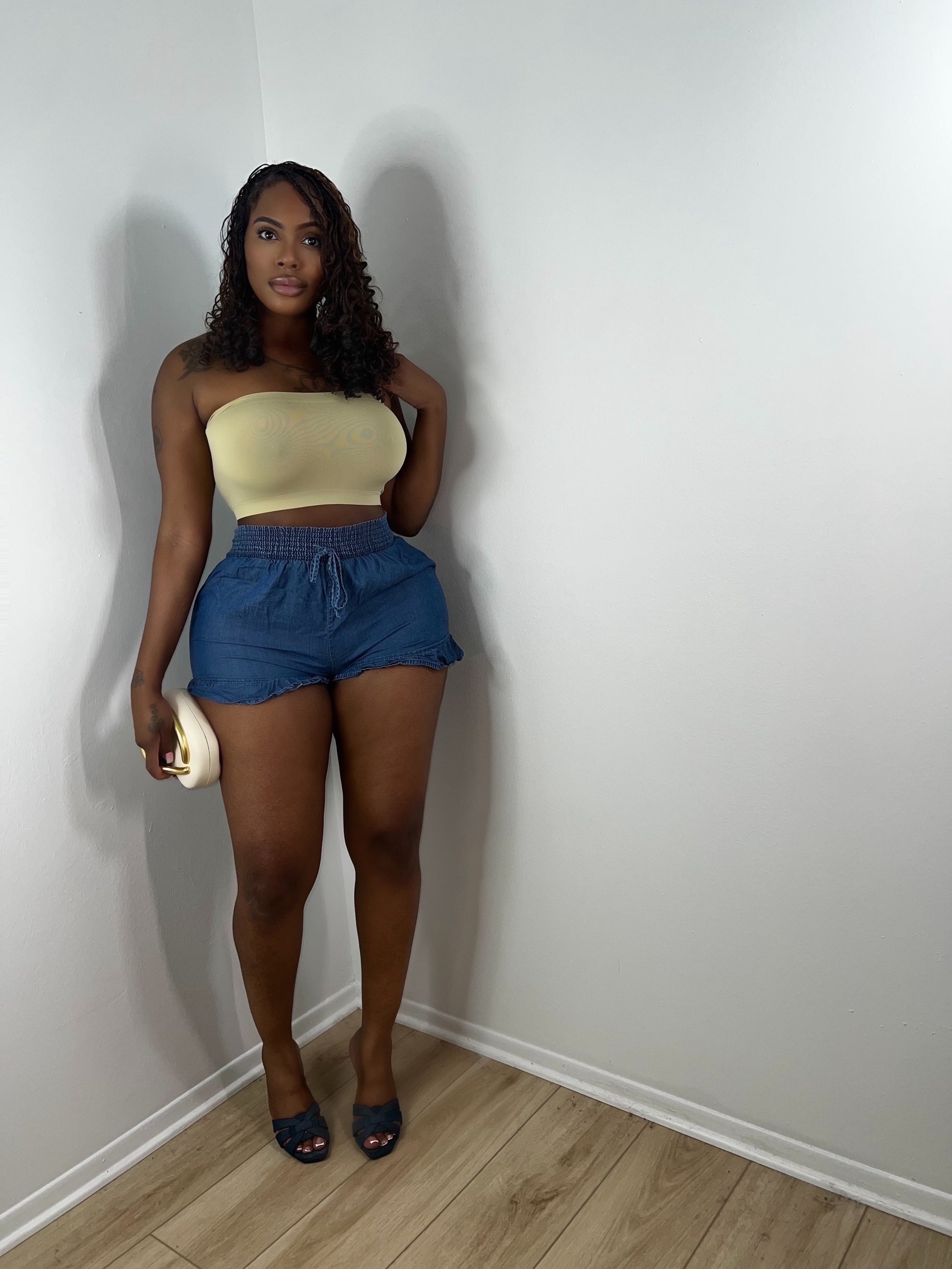 Ruffling feather denim shorts